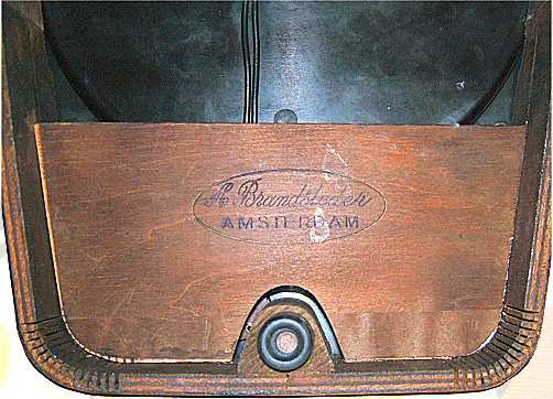Deze grammofoon staat op een rand van ingezaagd en gebogen multiplex, waarin het Brandsteder logo is ingebrand. Het bakelieten dek is Amerikaans, en waarschijnlijk door Brandsteder geimporteerd. Onder de toonkop zit een bakje voor de afgewerkte naalden. Anton Brandsteder start in 1924 een meubelfabriekje in de Kerkstraat in Amsterdam. Halverwege de jaren '50 is het bedrijf gevestigd in de 3e Schinkelstraat en maakt het onder meer radio, tv en grammofoonmeubels "op maat". Mills was een Amerikaanse fabrikant van "coin operated" amusement zoals slot machines, jukeboxen en filmautomaten plus bijbehorende accessoires zoals luidspreker en afstandsbediening. De jukebox produktieperiode loopt van 1928 tot 1948. In 1948 is het bedrijf verkocht aan plaatsgenoot H.C. Evans Company. De meest interessante machines zijn gemaakt tussen 1939 en 1941. Bekende modellen zijn de 'Throne of Music' en de 'Empress'. Dit toestel is eigendom van Marcel Bloemen. |