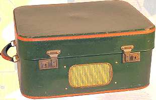 Deze Braun koffergrammofoon uit 1954 heeft een versterker met U-buizen en een luidspreker.