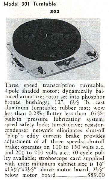 Het toestel werd geleverd zonder arm. Links en rechts zit een handle, in het midden een draaiknop: Aan/uit, Fijnregeling en Snelheid. Deze draaitafel dient te worden gemonteerd op een stevige, liefst massieve plint, zodat de trillingen van de motor en aandrijving voldoende worden onderdrukt. De zilversmid George Wickes startte in 1722 het bedrijf in Londen dat in 1735 werd omgedoopt tot Garrard. In 1915 werd 'Garrard Engineering and Manufacturing Company' in Willesden, North West London opgericht. Dit bedrijf was een onderdeel van 'Garrard the Crown Jewellers', en maakte precisie onderdelen voor Defensie. Na de eerste wereldoorlog werd de productie van veermotoren opgepakt. Het eerste model heette Number 1. Al snel verhuist de fabriek naar Swindon, Wiltshire. In 1930 komt Garrard uit met een complete grammofoon, in 1932 wordt de eerste platenwisselaar geproduceerd, de RC 1. In 1945 ontstaat 'The Garrard Engineering and Manufacturing Company Ltd'. In 1954 wordt de eerste HiFi draaitafel gepresenteerd, de 301. In 1958 brandt de fabriek af, maar met hulp van de Plessey Company Ltd wordt de productie weer snel hervat.