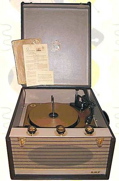 De knoppen aan de voorzijde zijn voor Aan/uit-Volume, Bass en Treble. De wisselaar is gemonteerd onder het deksel. Deze speelt de platen automatisch af, wanneer de diameter verschilt dienen de kleinere platen boven de grotere te liggen. De geschiedenis van His Master's Voice gaat terug tot 1897. The Gramophone Company startte in Londen met de verkoop van grammofoons en vlakke geluidsplaten, een Amerikaanse uitvinding die toen 10 jaar oud was. In 1921 opende het bedrijf de eerste grammofoonplatenwinkel op het adres 363 Oxford Street.