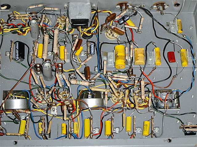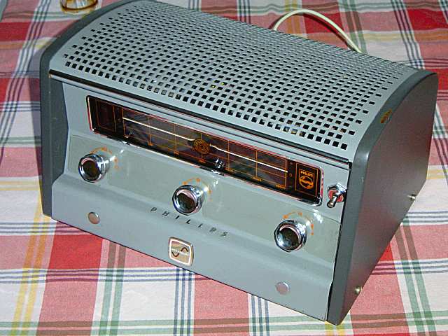 Het digitale archief werd geraadpleegd en bij de gegevens van de AD5040 wordt vermeld dat bij deze luidspreker de versterker AG9006 geadviseerd wordt. Nou ja, geadviseerd, er is maar één versterker met een uitgangsimpedantie van 1200 ohm en dat is de AG9006. De AD5040 is van 1959 en de versterker van enkele jaren eerder. In ieder geval staat hij vermeld in de Philips brochure "High-Fidelity, een nieuw gebied van geluidsweergave" uit 1957. Hierin wordt bij de genoemde versterker de luidsprekerset AD5032 geadviseerd met de "lieve" prijs van 895 gulden. Een groot bedrag in die tijd. De versterker zelf kostte 495 gulden en werd alleen voorbijgestreefd door de voor- en eindversterker-combinatie AG9004 en AG9007, samen voor de aanschafprijs van 1250 gulden! Overigens is deze set 800 ohm. Dus niet passend bij mijn luidsprekerkast. De speakers in de kast zijn de volgende: AD4200 lage tonen weergever, een AD3700 400 ohm en een van 800 ohm. Dit was toch wel verrassend. De AD4200 wordt als zodanig niet genoemd op de magneet, maar met het bijzondere typenummer 4924288. Dat maakt nieuwsgierig. Herman, die graag op onderzoek gaat, had de AG9006 al snel op een Duitse veilingsite achterhaald en vroeg of ik interesse had. Uiteraard had ik dat. Hij ziet er nog goed uit. Redelijk origineel met dien verstande dat er een microfooningang op gemaakt was en dat ziet er op de chassisplaat niet fraai uit met eenvoudige kroonstenen. Om die reden zitten er ook twee extra draaiknoppen op de plint van het front. De seleengelijkrichters zijn helaas ook vervangen en dat verdiend dus ook extra aandacht. Gelukkig zitten alle originele condensatoren er nog op. Ook dit vraagt natuurlijk aandacht. Onze technische man Peter gaat er de komende weken mee aan de slag.