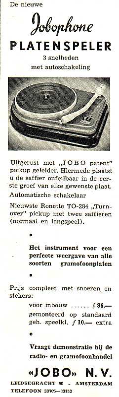 Rechts op het dek zit een "snelheidspookje" in Joboton stijl. Het mechanisme is voorzien van een automatische stopinrichting. Een hendel voor het instellen van de plaatdiameter zit onder de arm. Een losse 45-toeren puck behoort tot de standaarduitrusting. De naam JoBo is afgeleid van de naam van de eigenaar-oprichter, Joek de Boer. Hij richt het bedrijf in 1945 op, samen met zijn broer Ton. De verkoop was in handen van Jacques Sieverding. Joek de Boer overlijdt eind jaren '40. Van 1946 tot 1963 worden door Jobo grammofoons gemaakt. De ontwerpen vallen meestal op door hun originaliteit en zijn afkomstig van Ton de Boer. De wisselaars heten Joboton, de gewone spelers Jobophone. Dit toestel is eigendom van Hennie Overdijk. |