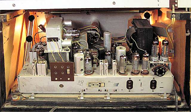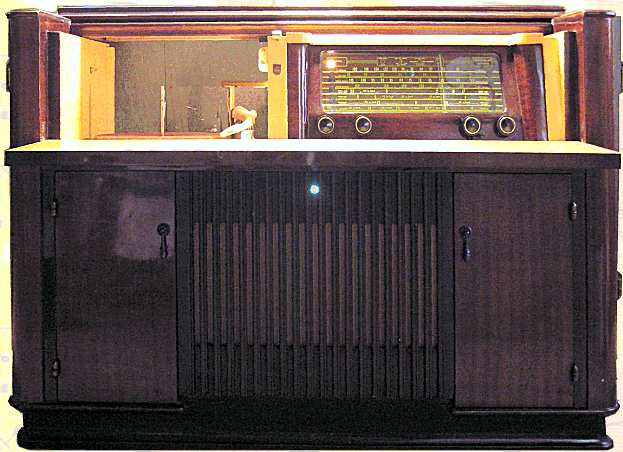 De FM detector is een schakeling met een 7-rooster buis (enneode). Links en rechts van het luidsprekercompartiment is ruimte voor het opbergen van grammofoonplaten. Dit toestel is eigendom van Robert Sarbell |