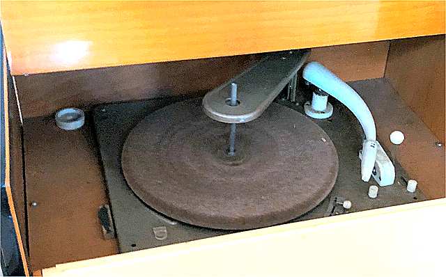 Voor een betere toegang tot de bedieningsorganen van de platenwisselaar kan de afstemschaal naar voren worden geklapt. Het toestel is uit 1952. De knop links is voor Volume-Aan/uit en Pickup, dan komt de Toonregelaar met Bas-schakelaar en rechts de knoppen voor het Golfbereik en de Afstemmen.