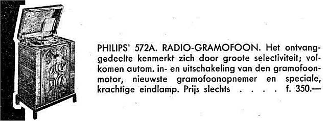 Twee naaldenbakjes behoren tot de standaard uitrusting. De knop boven het luidsprekerrooster is voor het Volume, rechts van de draaitafel zijn knoppen aangebracht voor de golfbereiken, afstemming en de toonregeling. In dit toestel is een van de eerste Philips Superhet radio-ontvangers gemonteerd. De Britse versie van dit meubel is de Philips 538A.