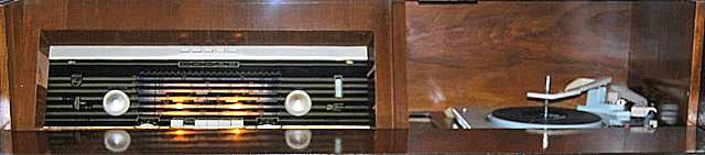 meubel op vier pootjes met daarin een AM afstemmer met 6 golfbereiken, mono versterker en